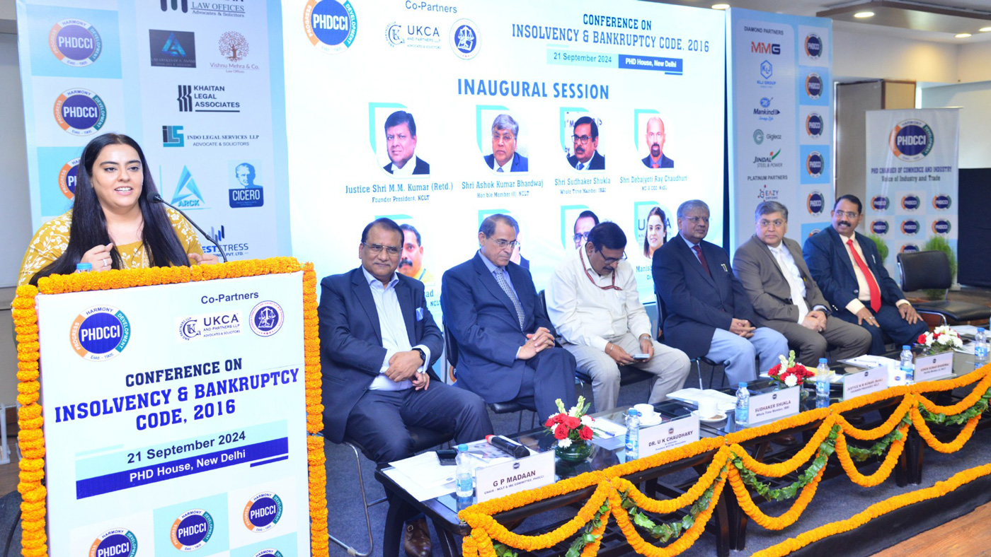 Manisha Chaudhary, Co-chair of the NCLT & IBC Committee at PHD Chamber of Commerce and Industry, speaking at the conference on the Insolvency and Bankruptcy Code.